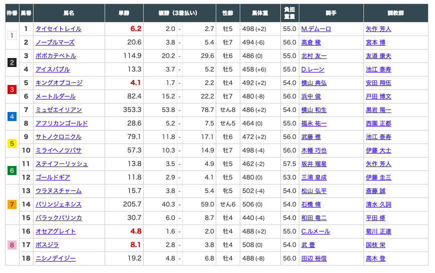 ⑤キングオブコージ、⑯オセアグレイトが単勝4倍台の人気の中心。①タイセイトレイル、⑰ボスジラまで単勝10倍以下。