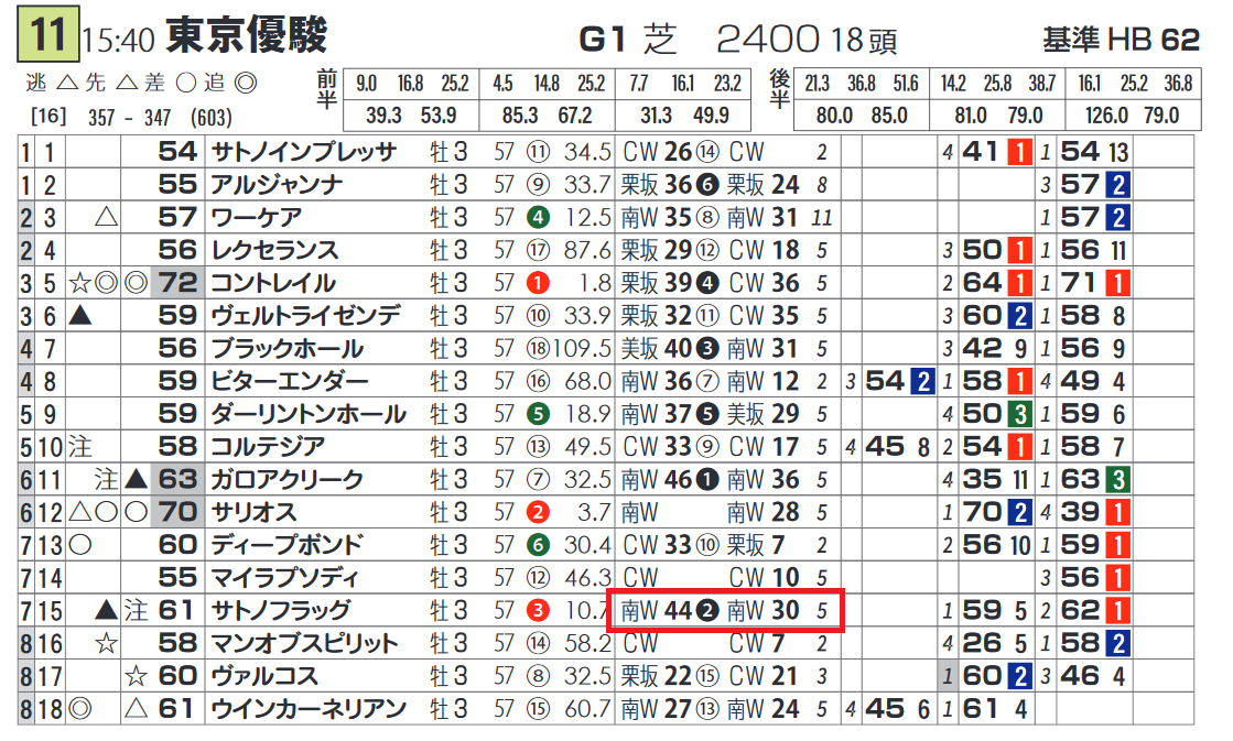 ⑤コントレイルが中心。相手大本線は⑫サリオス。⑮サトノフラッグ、⑪ガロアクリーク、③ワーケア、⑱ウインカーネリアンが相手候補。