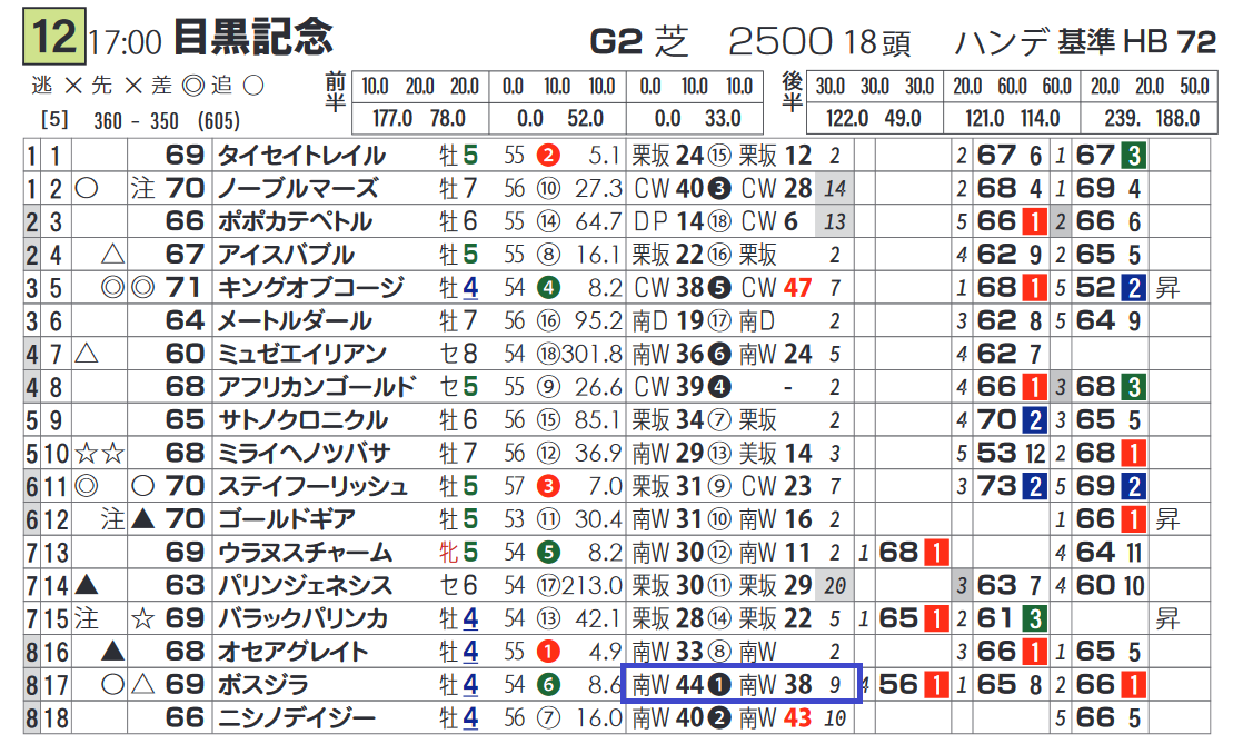 ⑤キングオブコージが中心。相手本線は⑰ボスジラ、⑯オセアグレイトの2頭。⑫ゴールドギア、④アイスバブルも末脚は上位。