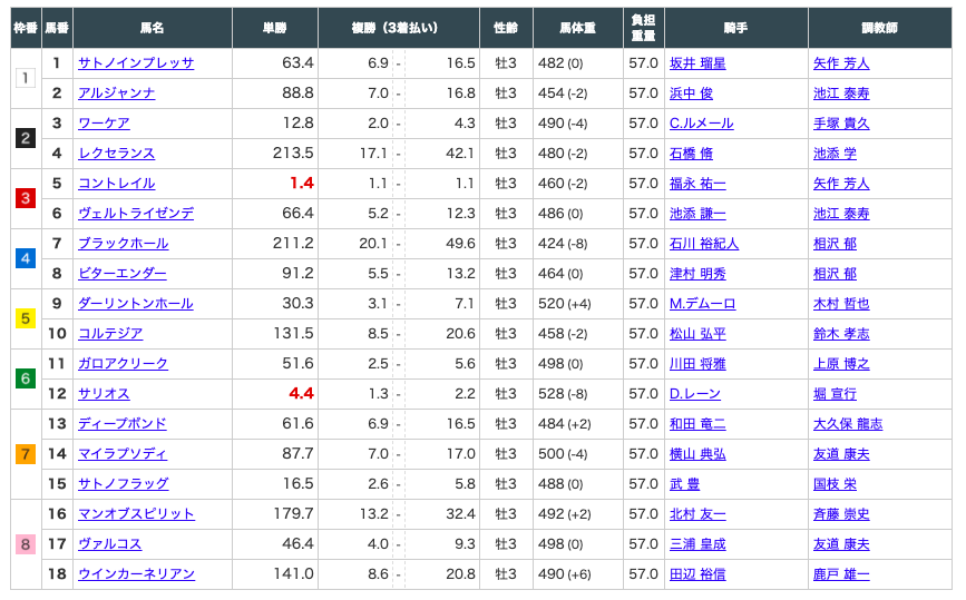 ⑤コントレイルが単勝1倍台中団の断然人気。⑫サリオスが単勝4倍台の2人気。単勝10倍以下は2頭だけ。⑪ガロアクリーク、⑱ウインカーネリアンが人気薄で妙味あり。