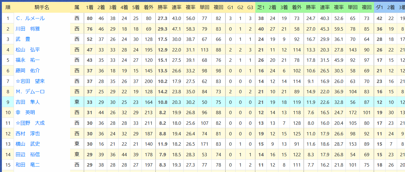 「騎手の該当競馬場の成績」=勝ち数1位、勝率28.6%&複勝率62.9%
