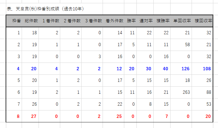 「インスタグラム」「ツイッター」に書いた通り、4枠が最多の4勝、複勝率40%と優秀。