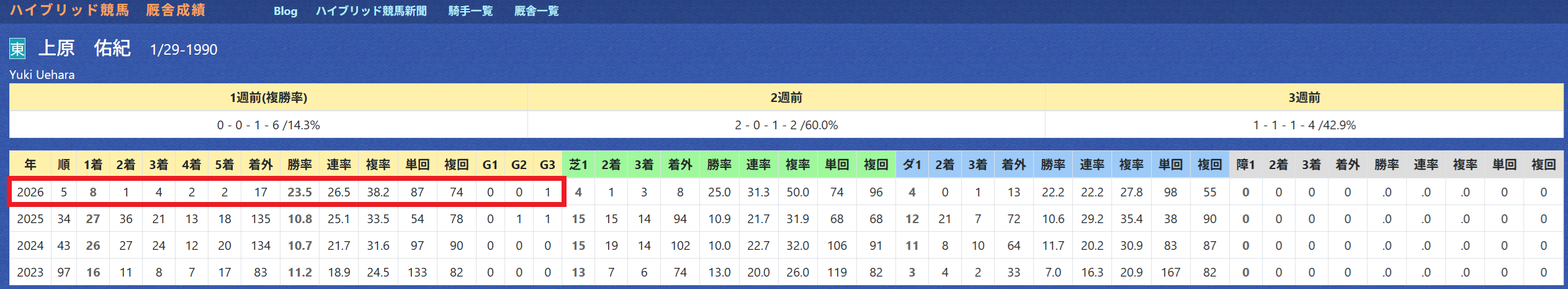 2026年02月17日 【データ分析】上原佑紀厩舎 【上原佑紀厩舎】開業4年目でリーディング5位と絶好調。年度別成績重賞は勝率25%&複勝率50%の好成績。重賞の成績→トップページからログイン→「HBビューワ」→「厩舎成績」※会員登録(無料)で利用可能⇒「インスタグラム」「ツイッター」にて他情報も更新中