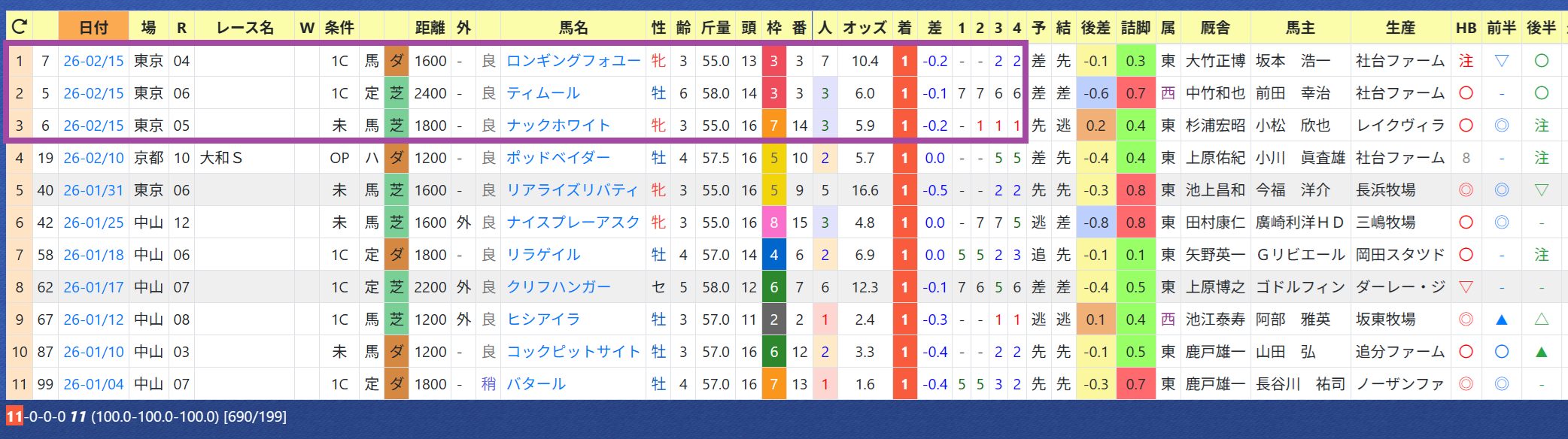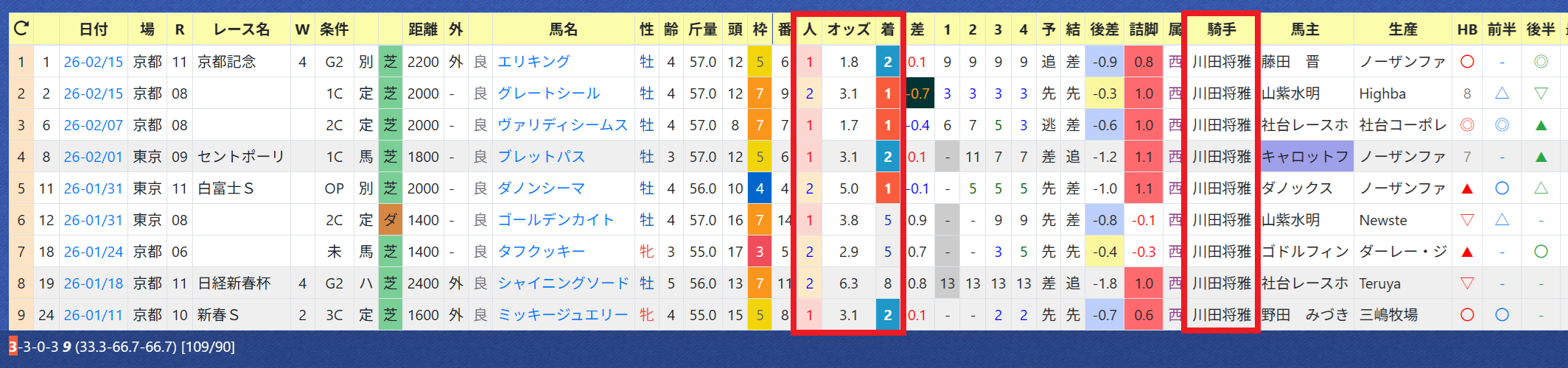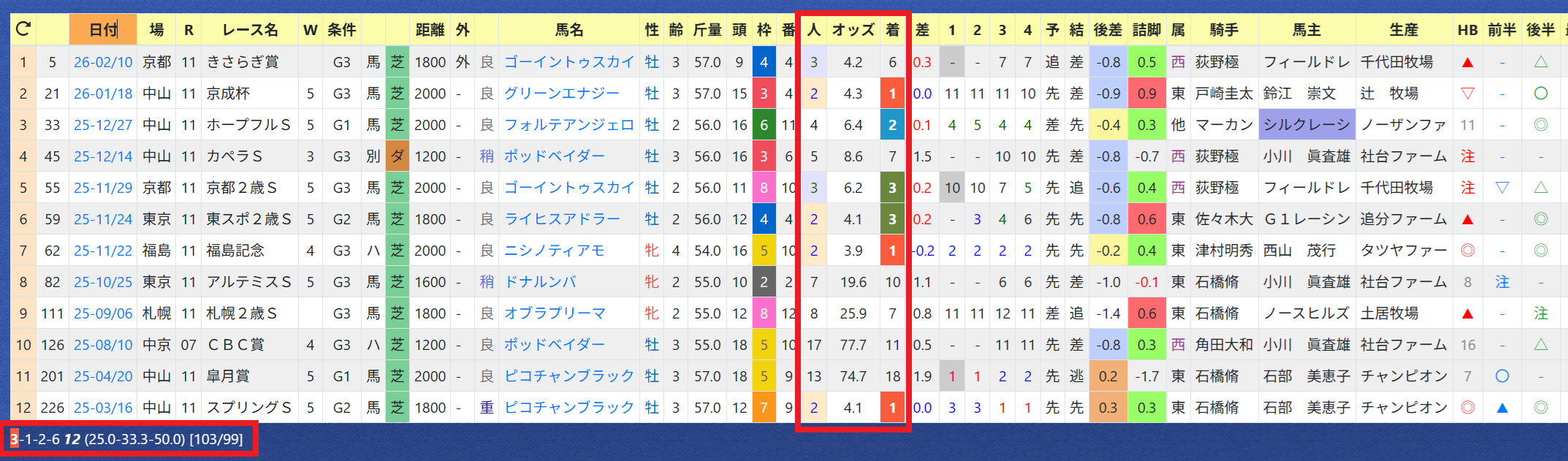 2026年02月11日 【データ分析】中内田充正厩舎 【中内田充正厩舎】昨年はリーディング3位。年度別成績今年も「推定後半3ハロン」5位以内は勝率27%&複勝率54%、単勝回収率&複勝回収率100%超え。京都記念のエリキングはチャンス大。「推定後半3ハロン」5位以内の成績→トップページからログイン→「HBビューワ」→「厩舎成績」※会員登録(無料)で利用可能⇒「インスタグラム」「ツイッター」にて他情報も更新中