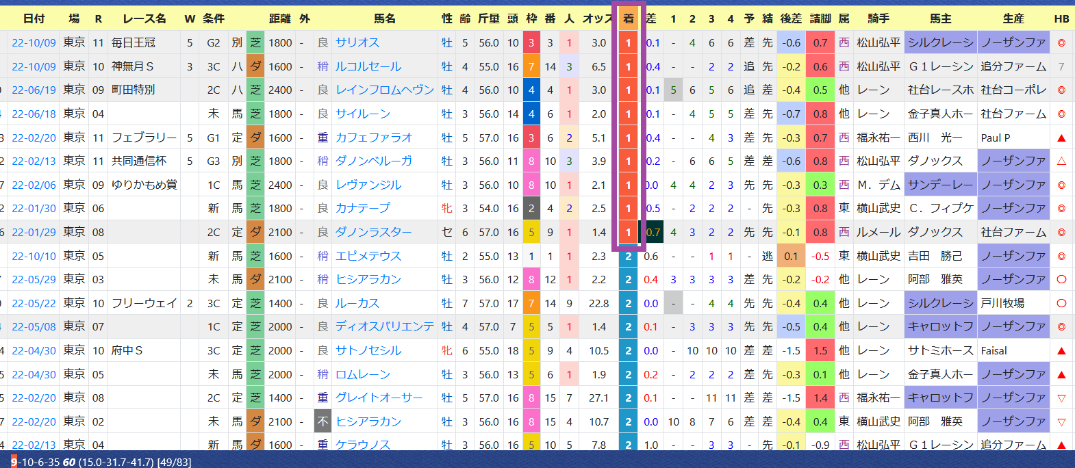 2022年10月11日 【データ分析】堀宣行厩舎 【堀宣行厩舎】毎日王冠をサリオス、南部杯をカフェファラオで制覇。先週の成績今年の20勝中、東京コースで9勝。連対率30%超え&複勝率40%超えの好成績。東京コースの成績松山騎手とのコンビは好相性。騎手の勝ち数ランキング→トップページからログイン→「HBビューワ」→「厩舎成績」※会員登録(無料)で利用可能⇒「インスタグラム」「ツイッター」にて他情報も更新中