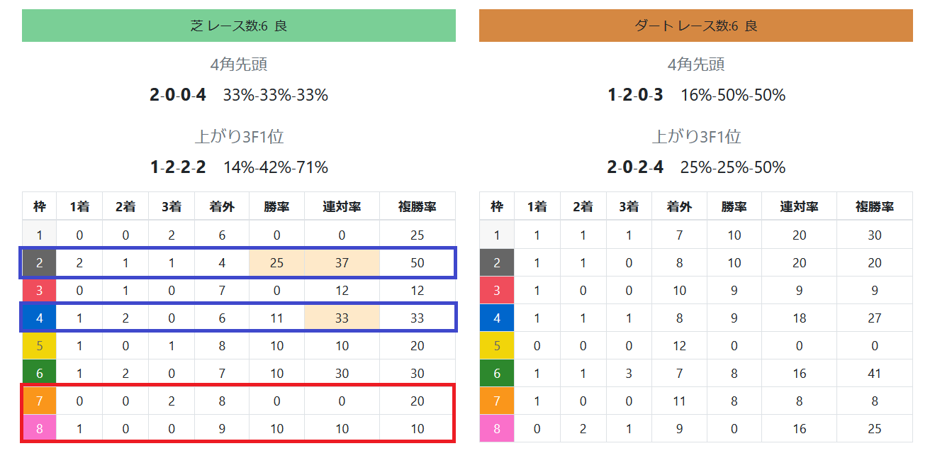 2022年10月07日 【データ分析】東京競馬場の芝の馬場傾向 【東京競馬場の芝の馬場傾向(昨年の開幕日)】2枠が2勝、勝率~複勝率すべてトップ。4枠が次点。7枠&8枠で計1連対のみ。枠番別成績芝6レース中、勝ち鞍の5頭が4角5番手以内。開幕週で内枠の逃げ&先行馬が優勢。1~3着馬のコーナー通過順→トップページからログイン→「HBビューワ」→「当週馬場傾向」※会員登録(無料)で利用可能⇒「インスタグラム」「ツイッター」にて他情報も更新中
