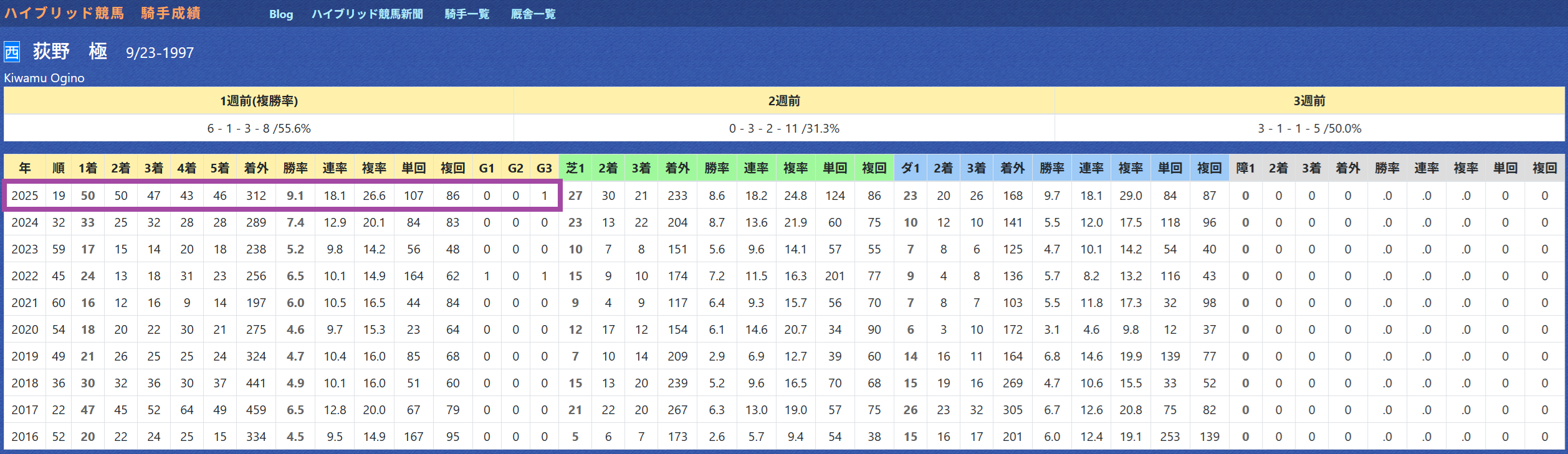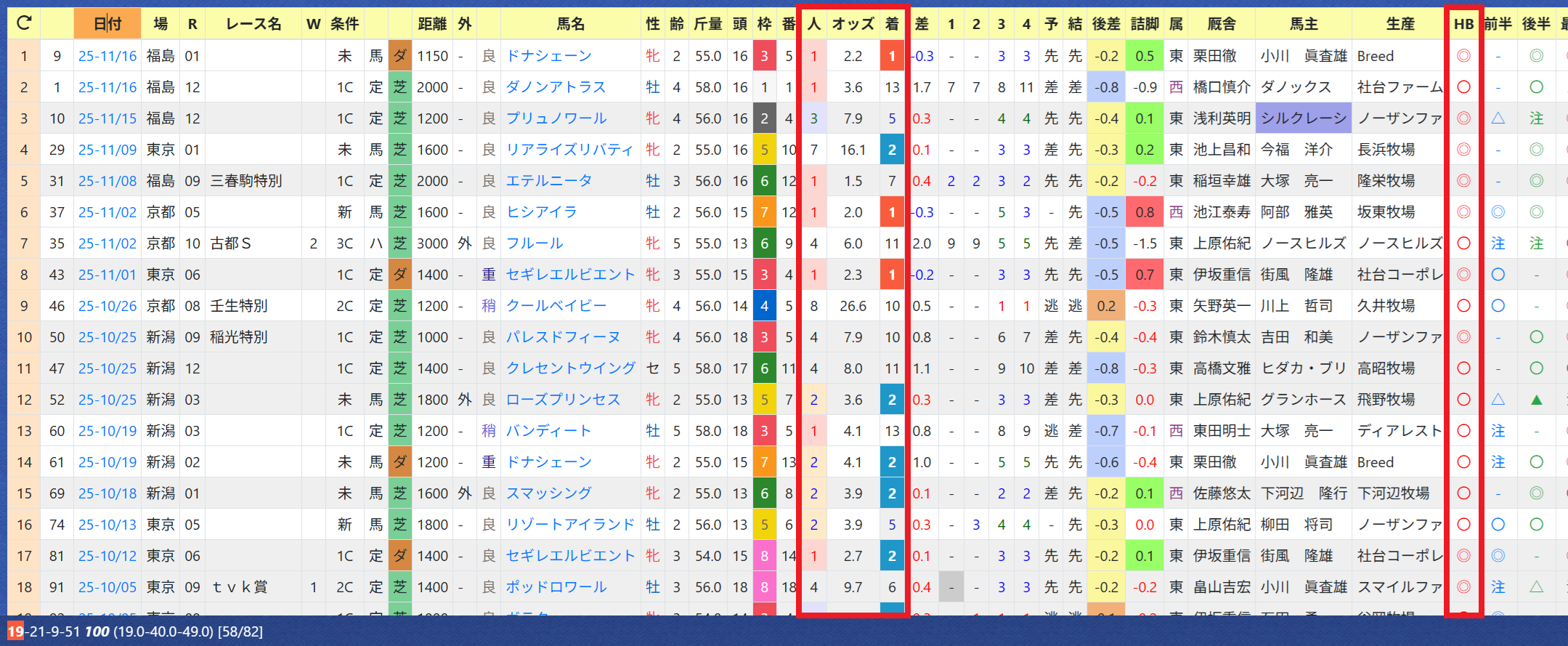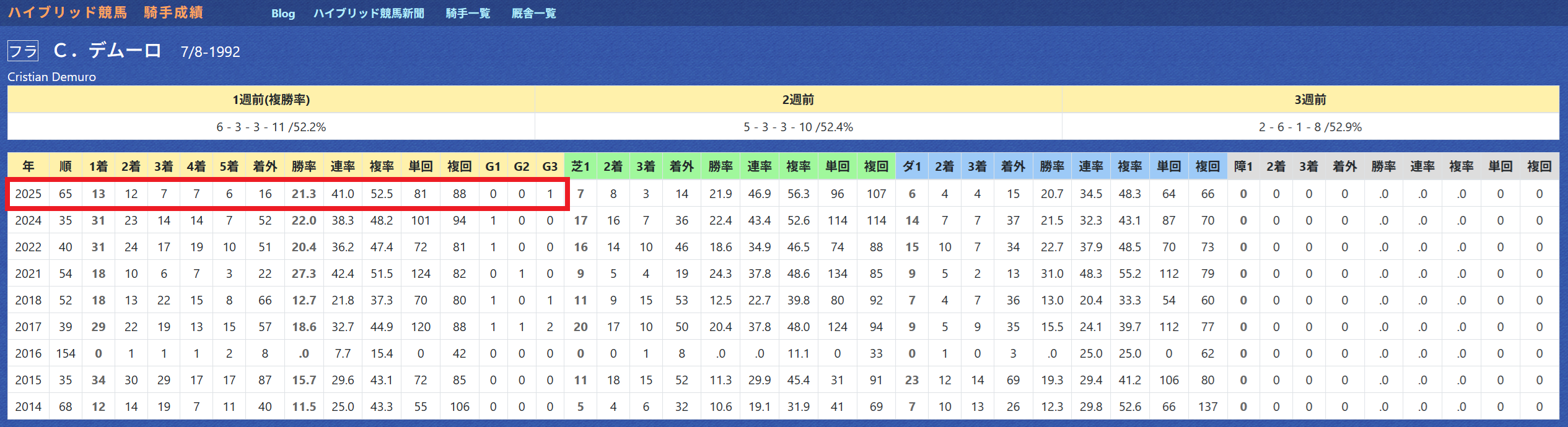 2025年11月19日 【データ分析】C.デムーロ騎手 【C.デムーロ騎手】先週も6勝の固め打ち。勝率21%&複勝率52%と優秀。年度別成績「推定後半3ハロン」5位以内で連対率50%のハイアベレージ。マイルCSのソウルラッシュもチャンス十分。「推定後半3ハロン」5位以内の成績→トップページからログイン→「HBビューワ」→「騎手成績」※会員登録(無料)で利用可能⇒「インスタグラム」「ツイッター」にて他情報も更新中