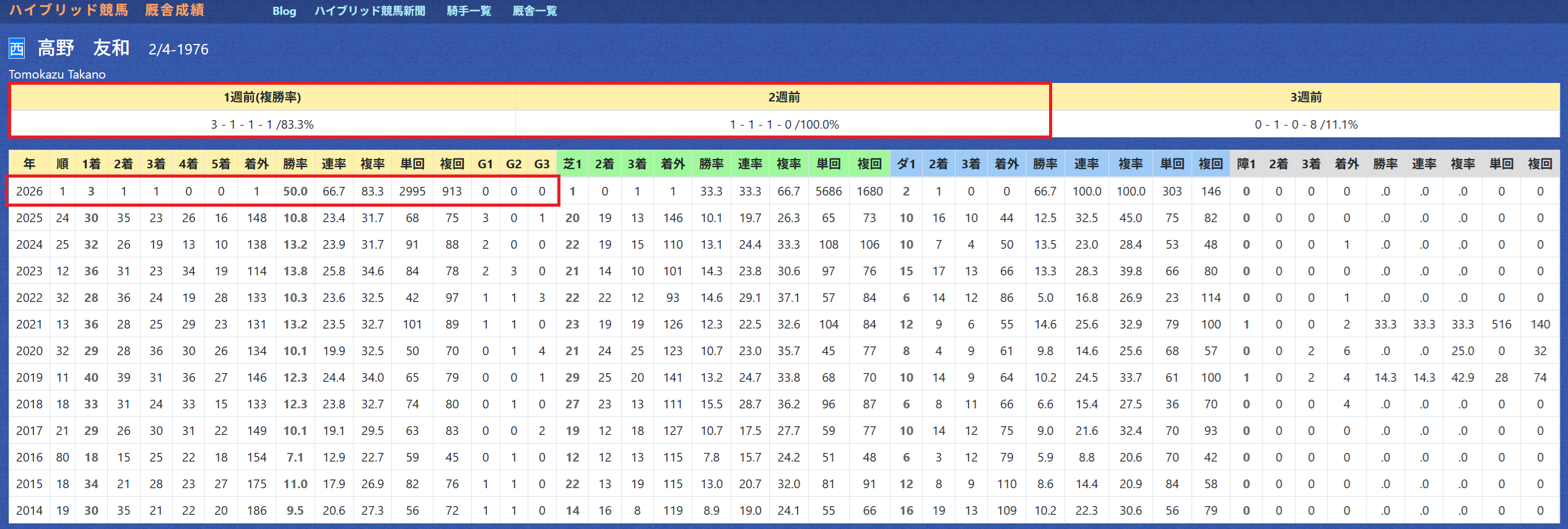 2026年01月07日 【データ分析】高野友和厩舎 【高野友和厩舎】京都金杯は最低人気のショウナンアデイブで3着。初週はリーディング1位の好発進。年度別成績近2週で4勝&複勝率89%と絶好調。近2週の成績→トップページからログイン→「HBビューワ」→「厩舎成績」※会員登録(無料)で利用可能⇒「インスタグラム」「ツイッター」にて他情報も更新中