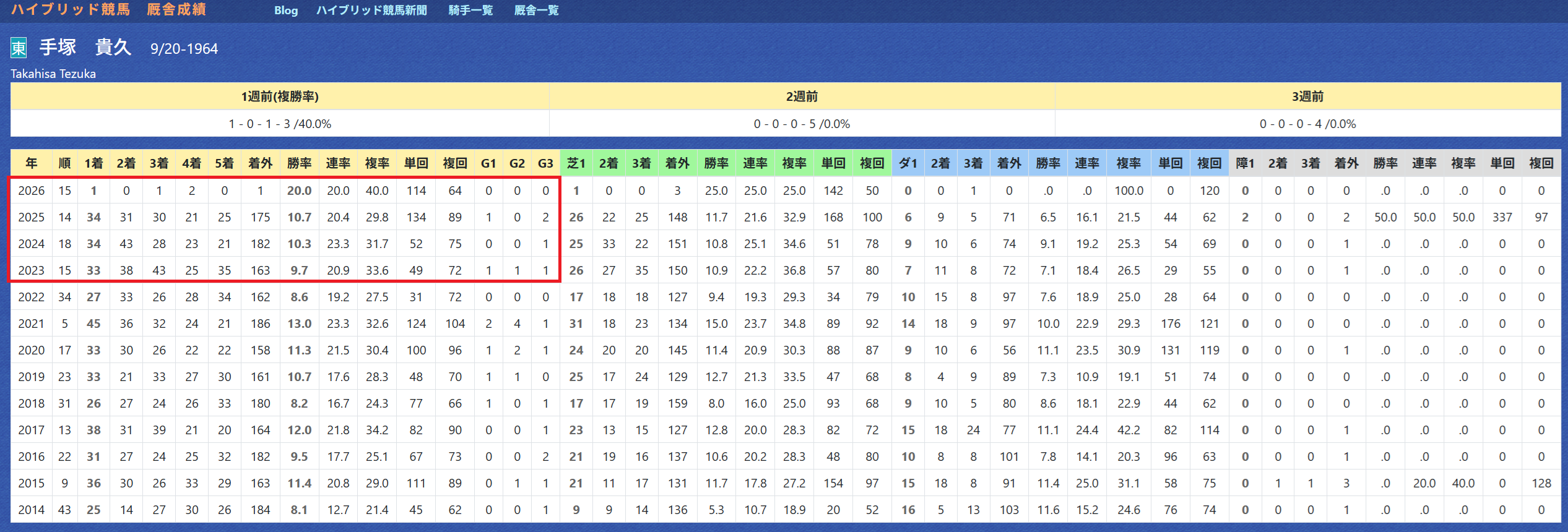 2026年01月08日 【データ分析】手塚貴久厩舎 【手塚貴久厩舎】近3年は30勝台。年度別成績重賞の「ハイブリッド指数」5番手以内は勝率15%&複勝率55%の好成績。フェアリーSのギリーズボール、シンザン記念のディアダイヤモンドもチャンスあり。重賞の「ハイブリッド指数」5番手以内の成績→トップページからログイン→「HBビューワ」→「厩舎成績」※会員登録(無料)で利用可能⇒「インスタグラム」「ツイッター」にて他情報も更新中