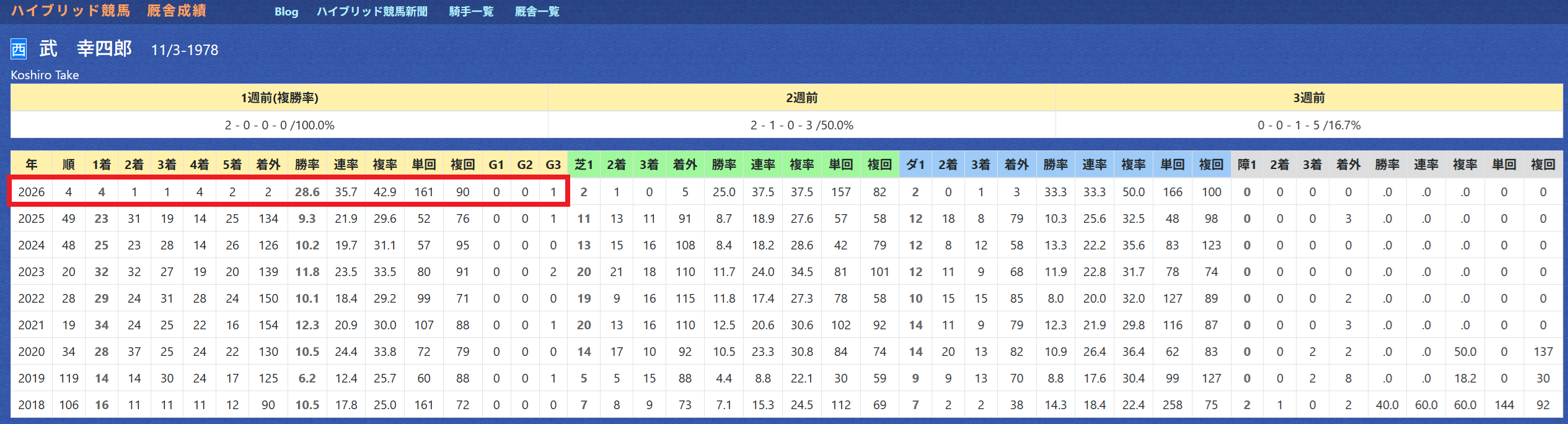 2026年01月20日 【データ分析】武幸四郎厩舎 【武幸四郎厩舎】ルメール騎手とのコンビで3連勝中。リーディング4位と好調。年度別成績「ハイブリッド指数」1番手では昨年8月から13レース連続して馬券圏内。「ハイブリッド指数」1番手の成績→トップページからログイン→「HBビューワ」→「厩舎成績」※会員登録(無料)で利用可能⇒「インスタグラム」「ツイッター」にて他情報も更新中