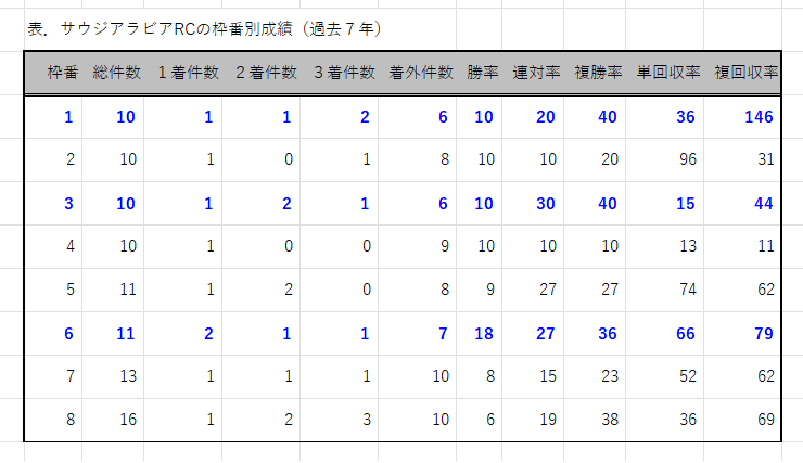 2024年10月04日 【データ分析】サウジアラビアRCの枠番別成績 【サウジアラビアRCの枠番別成績】6枠が2勝でトップ。複勝率は1枠&3枠が40%と優秀。少頭数+実力差が大きく、枠はほとんど関係なし。⇒「インスタグラム」「ツイッター」にて他情報も更新中