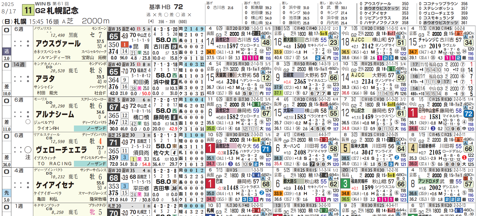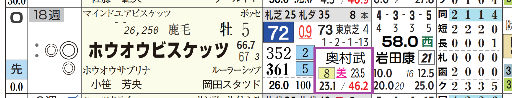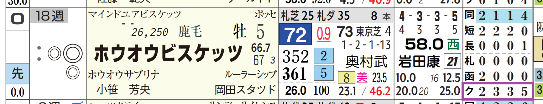 2025年08月14日 【想定版HB新聞】札幌記念 ■札幌記念の想定版■*画像は「ハイブリッド新聞」【新聞項目の説明】ハイブリッド新聞(タテ版):新聞内・ブログハイブリッド新聞(ヨコ版):新聞内・ブログデータシート:新聞内・ブログホウオウビスケッツは2走前&前走がハイレベル。「ハイブリッド指数」=《72》オープン&重賞でコンスタントに好走。「クラス成績」=【2・3・3・5】奥村武厩舎は札幌の芝の複勝率40%超えと優秀。「厩舎の該当競馬場の成績」=勝ち数8位、勝率23.1%&複勝率46.2%続きを読む