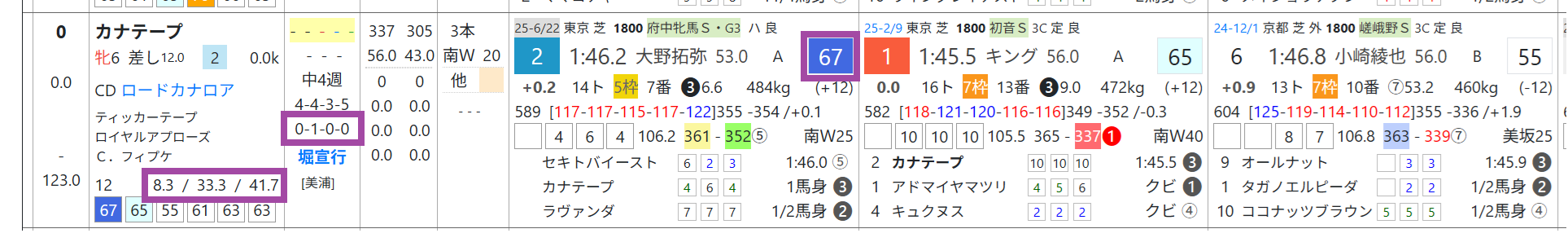 カナテープはオープン&重賞で1戦のみ、府中牝馬Sで「ハイブリッド指数」=《67》をマークして2着、堀厩舎は新潟の芝の複勝率40%超えと優秀。