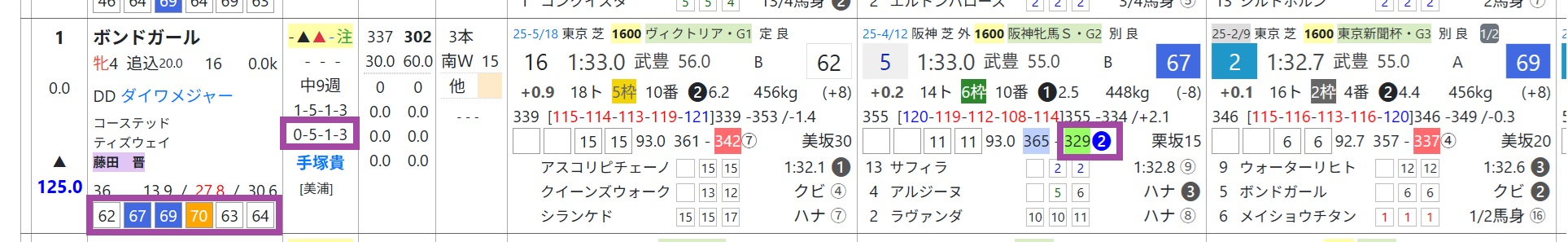 ボンドガールはオープン&重賞で5連対、阪神牝馬Sで上がり2位&32秒台、2~4走前は「ハイブリッド指数」=《70》前後をマーク。